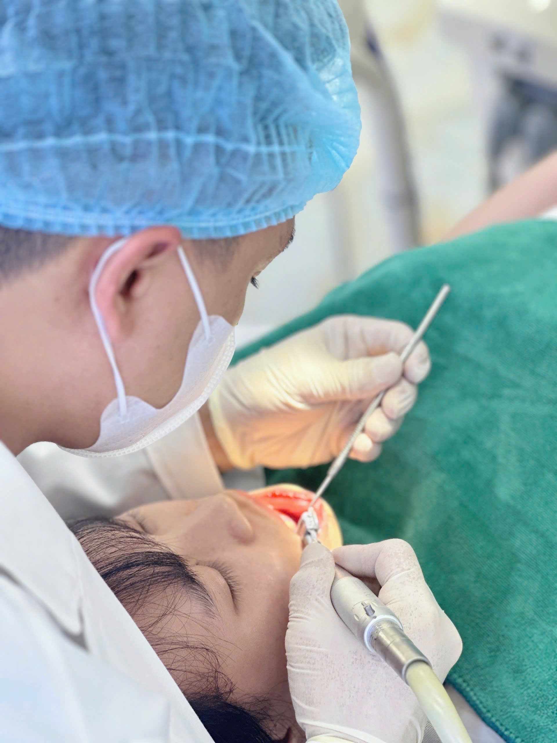 Tiếp theo là làm sạch răng chuyên sâu, bao gồm cạo vôi răng và đánh bóng. Bước này giúp loại bỏ mảng bám cứng đầu mà việc chải răng hằng ngày không thể làm sạch hoàn toàn.